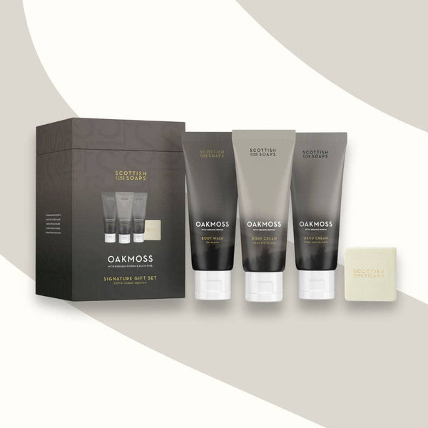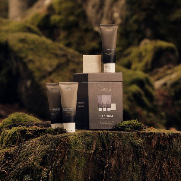 Enclose the tranquility of ancient Scottish woodlands with the Oakmoss Signature Gift Set. Infused with the earthy, aromatic notes of oakmoss, cedarwood and amber, this set brings the essence of nature to your daily routine. It includes a natural exfoliating Body Wash, oil-rich Body Cream, shea-infused Hand Cream and a triple-milled Hand & Body Soap, offering a complete care experience for soft, nourished skin.
